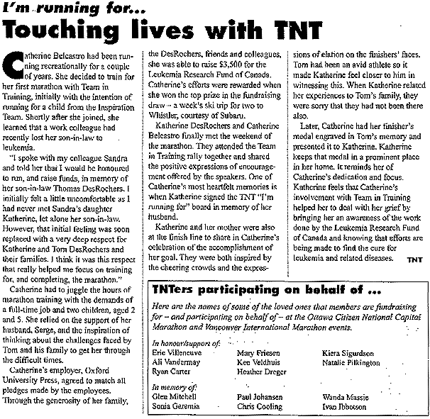 ![]() On October 17, 1999 Catherine Belcastro ran a 26.2 mile marathon (Toronto) in Tom's memory in order to help raise money for the Leukemia Research Fund of Canada. Although Catherine had never known Tom, she learned of his 'story' from her coworker Sandra, who is also Tom's mother-in-law. Their employer, Oxford University Press agreed to match all pledges made by the employees. Catherine raised an incredible $3,500 for the Leukemia Research Fund! Catherine later had her finisher's medal engraved in Tom's memory and presented it to Kathy, who was most touched by this gesture. All of Tom's family were greatly moved by having Catherine run in Tom's memory, particularly because Tom himself ran daily as part of his own fitness regime. It helps to heal the hurt of losing Tom when we know that he lives on in the hearts and spirits of others.... Thank you Catherine!