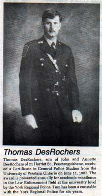Many of Tom's fellow officers have commented on his dedication to policing as well as his excellent investigative skills. Tom was also well known as someone who never passed up the opportunity to lighten things up with his practical jokes. We are always so grateful to hear stories that involve Tom's pranks and humour. Tom completed just about every course offered through the police service, along with his certificate in General Police Studies from the University of Western Ontario, in 1986. He completed his Advanced Police Studies at the university level in 1991 at the University of Western Ontario. In 1994, Tom obtained his Bachelor of Arts in History and Political Science from the University of Waterloo. Though he loved policing and working as a detective, Tom chose to go on and pursue a law degree in 1996. His intent was to continue to work with YRP, but in the capacity of a lawyer, and to eventually obtain a Master's degree in Law. On June 12, 1998, Tom graduated from Osgoode Law School. In December of 1998 Tom successfully completed the last of his Bar Admission Exams. Sadly, on January 24th, 1999 Tom passed away suddenly, just 5 days after diagnosis of Acute Myloid Leukemia (AML). A few weeks later, on February 26, 1999, Tom was Called to the Bar posthumously at Roy Thompson Hall. This is the only time in the history of the Law Society of Upper Canada that this has ever occurred. Tom had been seriously ill throughout his last year of law school, articling, and taking his Bar Exams, while continuing to work for YRP as a Detective. We remain in awe of his ability to accomplish these goals despite unknowingly battling acute leukemia.